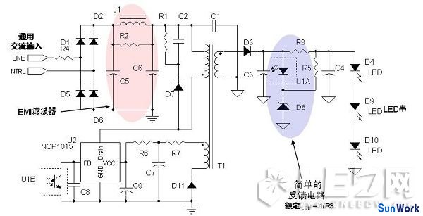 LED電源電路大多是由開關電源電路+反饋電路這樣的形式構成,反饋電路從負載處取樣后對開關電路進行脈沖的占空比調整或頻率調整,以達到控制開關電路輸出的目的。
