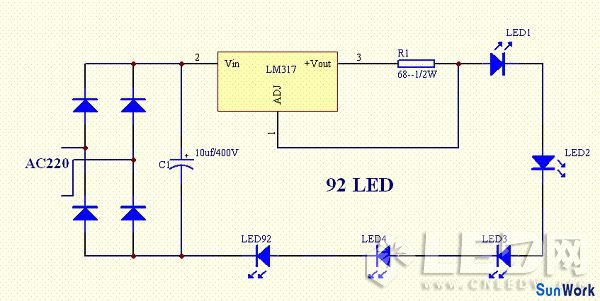 LED要恒流供電,不然容易老化損壞??梢杂肔M317,原理是利用317的啟探控電壓不變,再除電阻,就是恒流值。電路如下圖。燈可以根據需求接多少個。改變R1可改變電流,電流=1.25/R1。