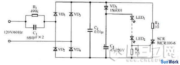 圖所示為采用可控硅的電容降壓驅動電路。在該電路中,可控硅SCR和R3組成保護電路,當流過LED的電流大于設定值時,SCR導通一定的角度,從而對電路中的電流進行分流,使LED工作于恒流狀態(tài),從而避兔LED因瞬間高壓而損壞。