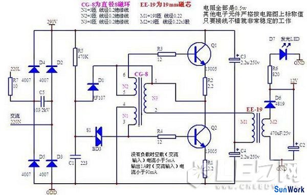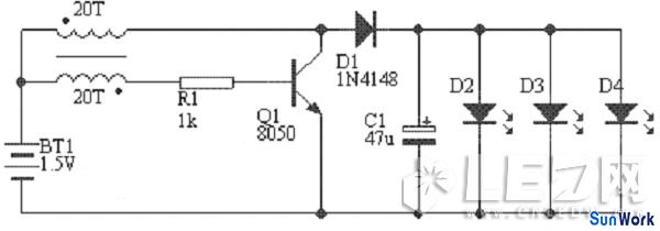 附圖中升壓變壓器可用節(jié)能燈的磁環(huán),用Φ0.21MM的漆包線雙線并繞20T,注意同名端不要接錯,LED根據需要接1-3只,調整R1使LED最亮,總電流在100MA以內。